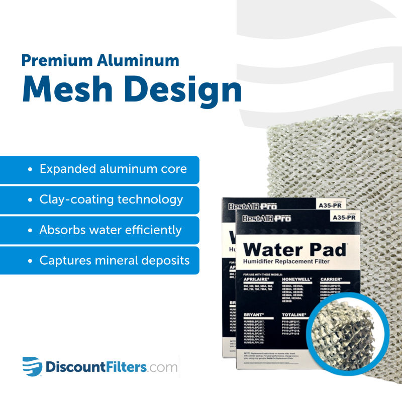 - Constructed using an expanded aluminum mesh pad covered with a special clay-like coating that absorbs water and removes mineral deposits