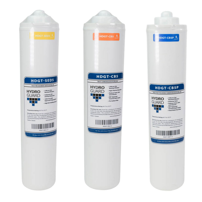 This kit includes everything you need to replace the pre/post filters for your HDGT HydroGuard twist reverse osmosis system. These are OEM, factory original filters from Hydronix.