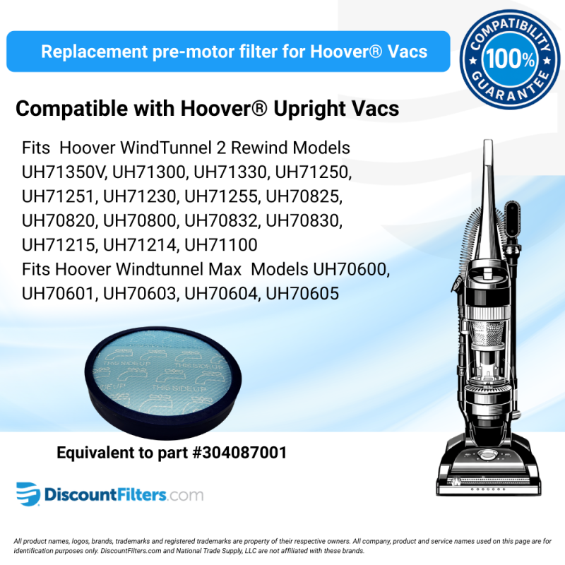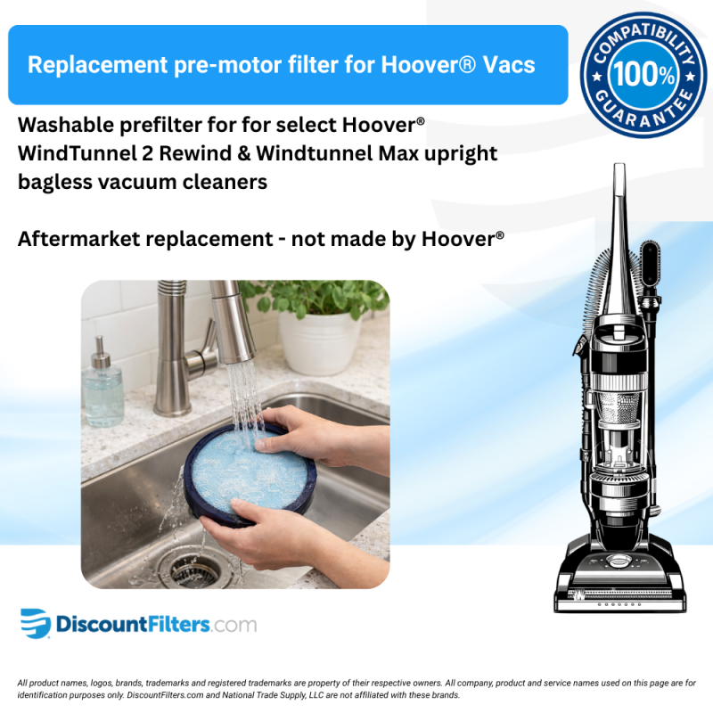Hoover® is a trademark of Techtronic Floor Care Technology Limited. which is not affiliated or otherwise associated with DiscountFilters.com. Any all all use of this mark on this site is for identification purposes only and such use is not intended to, does not, and shall not be deemed to imply any association or affiliation between National Trade Supply, LLC or DiscountFilters.com and Hoover®.