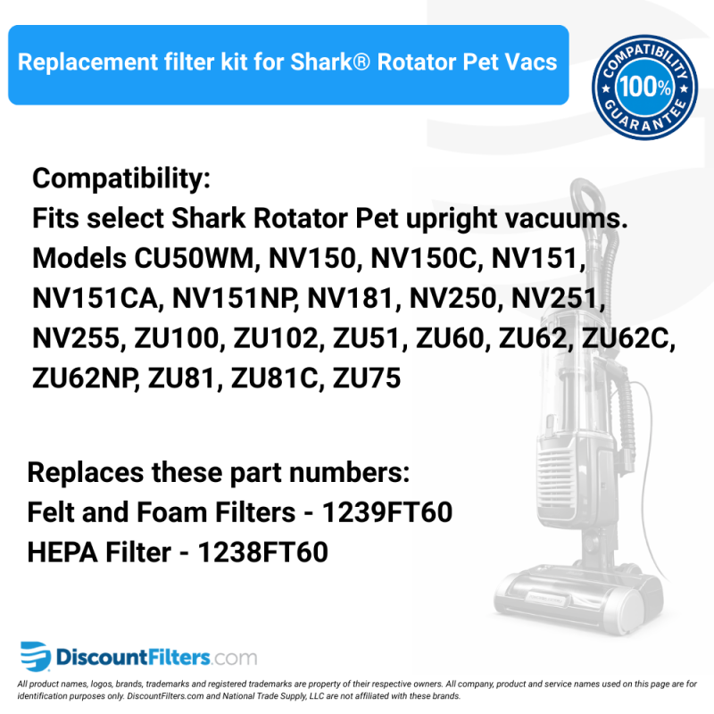 Shark® is a trademark of SharkNinja Operating LLC. which is not affiliated or otherwise associated with DiscountFilters.com. Any all all use of this mark on this site is for identification purposes only and such use is not intended to, does not, and shall not be deemed to imply any association or affiliation between National Trade Supply, LLC or DiscountFilters.com and Shark® or SharkNinja Operating LLC. Any use of the Shark® brand names or model designations for this product are made solely for purposes of demonstrating compatibility